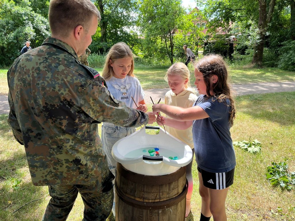 Nach der begründeten Patenschaft mit dem Stab des Panzerlehrbataillons 93 (PzLehrBtl 93) in Munster, trafen sich erstmals gut 60 Müdener Familien mit Soldatinnen und Soldaten des Stabes PzLehrBtl 93 zu einem Familiennachmittag am Heidesee in Müden. Der Förderkreis -NaturHeimat- Müden (Örtze) e.V. und der Stabes PzLehrBtl 93 hatten gemeinsam zu diesem bunten Nachmittag einladen. Das sonnige und warmer Wetter tat ein Übriges, um dieses erste Treffen zu einem Erfolg werden zulassen. Los ging es bereits um 13 Uhr, denn die Munsteraner Soldaten hatten verschiedene Stationen im Bereich des Heidesees zu einem tollen Wasservergnügen aufgebaut. Mit Kanu und Kajak gingen die Familien ins Wasser und mussten unterschiedliche Aufgaben lösen. Anschließend nutzten viele die Gelegenheit zu einer ausgiebigen Paddeltour über den See. Aber auch an Land konnten die Anwesenden diverse Spiele genießen. Unter anderem wurde Wikinger Schach und ‚Discgolf‘ gespielt. Im Anschluss an den vergnüglichen Spielenachmittag traf man sich an der Historischen Sägemühle zum gemütlichen Beisammensein bei Kaffee und Kuchen sowie bei gegrillten Würstchen und Steaks. Volker Nickel, 1. Vorsitzender des Förderkreises, bedankte sich für die große Teilnahme und nahm diesen Tag zum Anlass, die Patenschaft mit weiteren Familientagen zu bestärken. Dem pflichtete auch Faßberg’s Bürgermeisterin Kerstin Speder bei, die es sich nicht hatte nehmen lassen, an diesem ersten Familiennachmittag dabei zu sein.